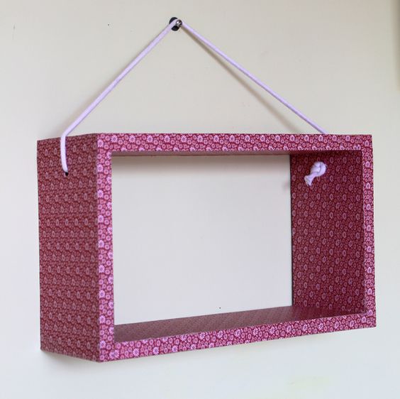 Pinte o nicho com a cor escolhida. Corte o tecido com o tamanho do fundo do nicho e dobre as bordas para dentro, para criar uma barra. Cole este pedaço de tecido no fundo do nicho. Para enfeitar, cole pedrarias na borda do nicho de MDF. E está pronto!