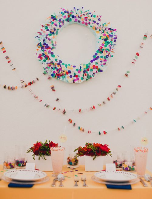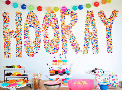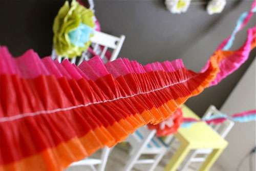 Papel, confete, tecido, papelão, fita adesiva decorada e papel contact são alguns dos muitos materiais que podem ser empregados neste tipo de artesanato. Faça artesanato para a parede atrás do bolo, para o teto e para as diversas mesas de sua festa. Lembrando que você deve seguir a cartela de cores já escolhida para a decoração.