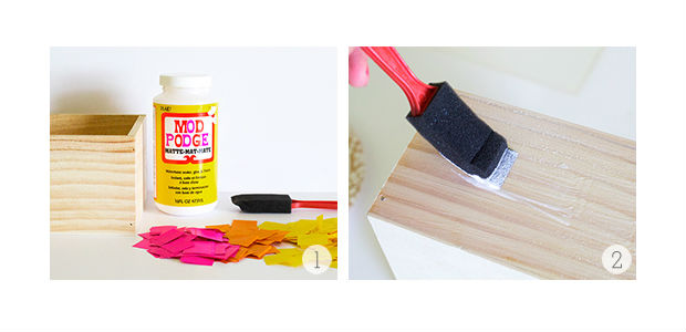 Aplique cola Mod Podge sobre a caixinha de MDF, nos locais aonde você pretende colar esses papeis.