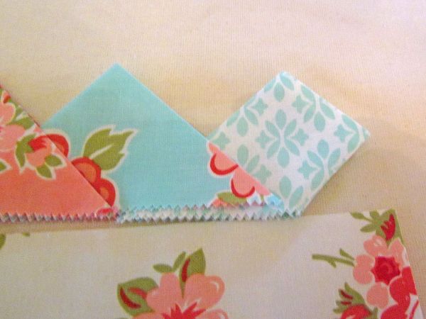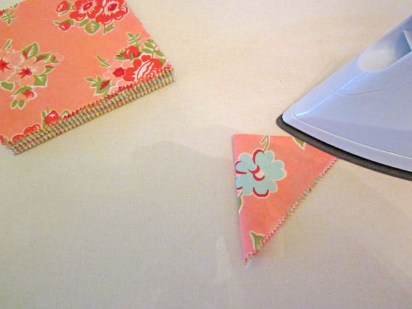 Logo após, siga passando todos os quadrados de tecido e transformando-os em triângulos. Depois posicione um triângulo dentro do outro.