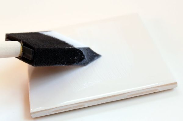 Em seguida, aplique a cola para decoupage sobre toda a parte de cima do azulejo, com o auxílio do pincel com esponja.