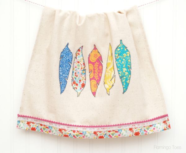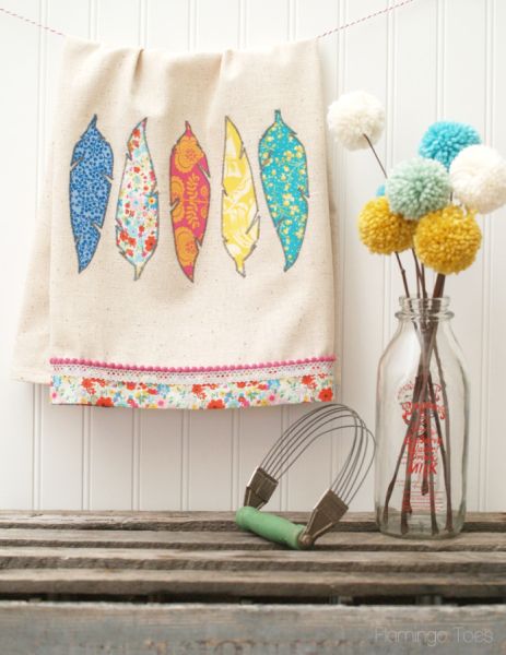 Créditos:http://www.flamingotoes.com/2014/02/pretty-diy-fabric-feathers-dishtowel/
