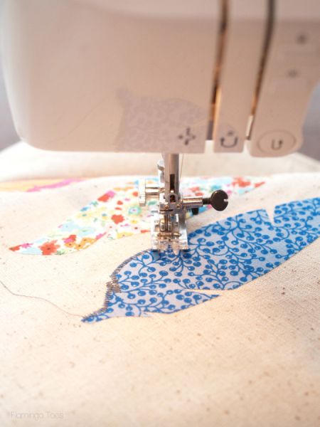 Logo após, com um ponto decorativo ou com o ponto em ziguezague de sua máquina de costura, contorne todas as penas, com a cor de linha de sua escolha.