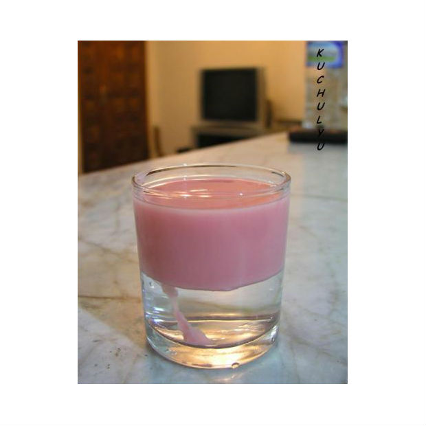 Logo, acrescente água quente até a metade de um copo de vidro e, em seguida, despeje a cera ainda quente e derretida sobre o recipiente, ocupando metade do espaço.