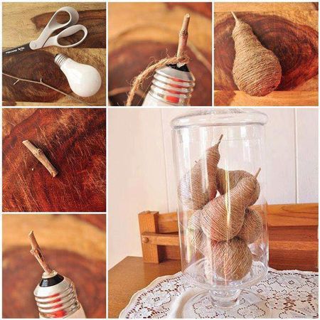 Comece separando todos os materiais que você vai utilizar em seu artesanato. Depois cole, com o auxílio da pistola de cola quente, um pedaço do galho seco na parte superior da lâmpada queimada. Cole a ponta do barbante, também com o auxílio da pistola de cola quente, na base do pedaço de galho seco. Vá enrolando o barbante ao redor da lâmpada queimada, colando em alguns pontos, a cada volta. Ao final do trabalho cole muito bem a ponta do barbante. E está pronta a sua pera estilizada!