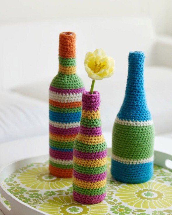 Para encapar uma garrafa de vidro com crochê com barbante, comece fazendo correntinhas com número suficiente para circundar a base da garrafa. Feche as correntinhas formando um círculo. Faça uma carreira de pontos baixos ou de pontos altos, de acordo com a sua preferência (na imagem, o crochê é feito com pontos baixos). Teste na garrafa se o tamanho está correto. Vá fazendo carreiras do ponto escolhido até chegar perto do pescoço da garrafa. Faça mais um teste, “vestindo” o crochê na garrafa. Vá diminuindo ponto conforme vai avançando pelo pescoço da garrafa. E deixe a borda superior aberta, para que a garrafa vire um vaso.