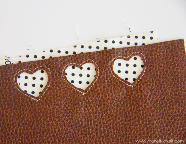Corte um pedaço de tecido de sua preferência para colar atrás desse corino e cobrir esses desenhos.