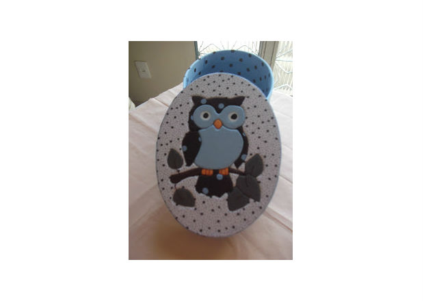 Veja que linda a caixinha da imagem acima, de formato oval, decorada com o tema de coruja, o símbolo da sabedoria e também de algumas profissões, como do professor, por exemplo.