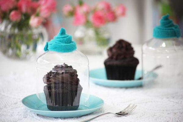 E para deixar o visual da sua mesa muito mais divertido, faça uma peça para cobrir docinhos ou outros alimentos, e apenas utilizando o pescoço da garrafa pet decorado com uma tirinha de feltro colada na parte superior simulando um cupcake.