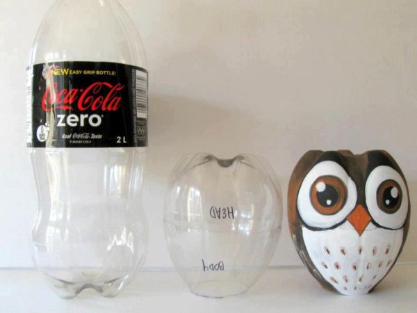 Ainda falando em artesanato para crianças ou para cantinho delas, você pode fazer uma simpática corujinha com garrafa pet, unindo o fundo e o pescoço e pintando a peça conseguida com o formato de uma coruja.