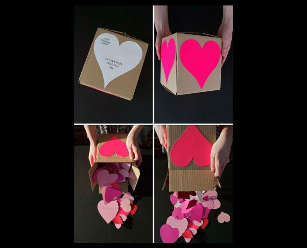 Acima você confere uma caixa de papelão, aonde poderá colocar inúmeros corações, confeccionados de papel colorido.