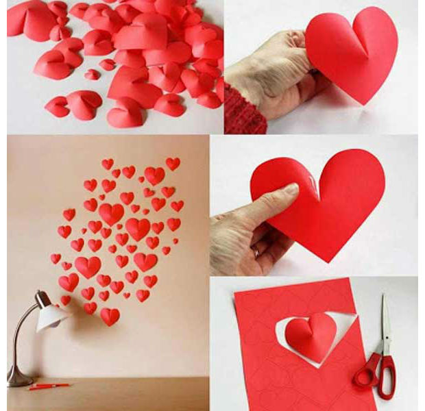 Com uma folha de papel na cor vermelha você pode fazer inúmeros corações, nos mais variados tamanhos, recortar, fazer o trabalho, como na imagem acima, e colar na parede de sua casa ou de onde você quiser.