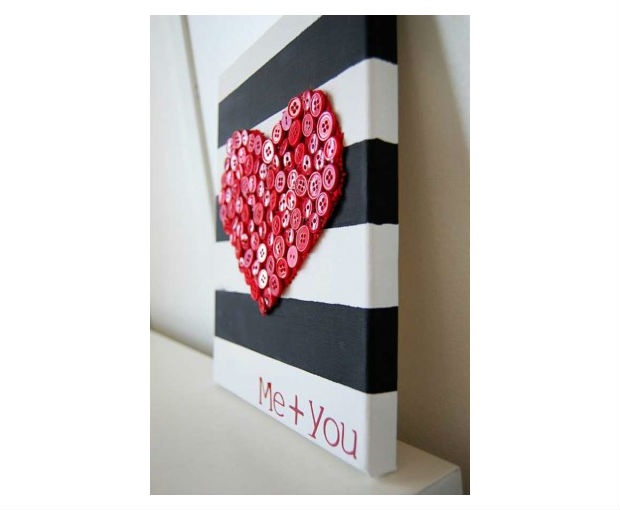 Para confeccioná-lo é preciso pintar a tela, do jeito que você preferir, e desenhar um coração, preenchendo-o com botões vermelhos.
