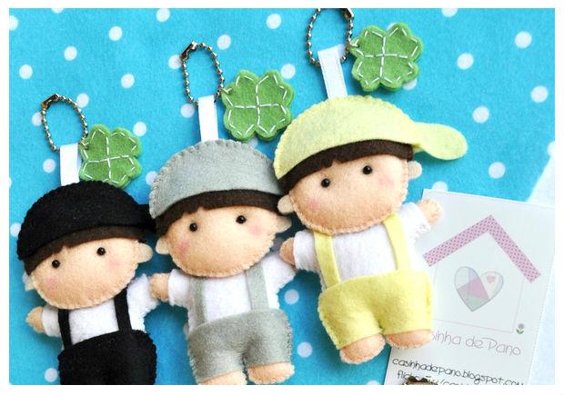 Outro chaveiro de feltro bacana você confere acima: bonequinhos de feltro com trevo para dar sorte.
