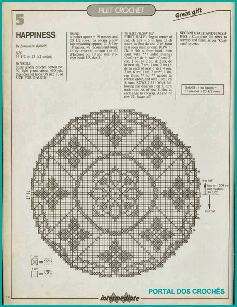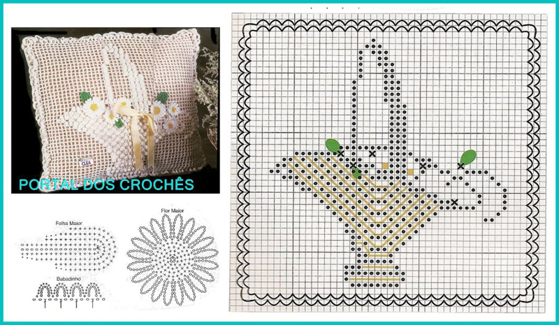 Comece separando todos os materiais que você vai utilizar no processo de como fazer almofadas de crochê passo a passo. Faça 50 quadradinhos. Cada quadradinho é feito fazendo 1 ponto alto, 2 correntinhas, até o final da carreira. Siga o gráfico e onde estiver fechado (com bolinha preta no meio), faça um ponto pipoca. O ponto pipoca consiste em fazer 5 pontos altos, tirar a agulha da laçada, passar a agulha da frente para atrás do 1° ponto alto feito, passar a agulha pela laçada e puxar a linha, para que forme a pipoca. Se você não sabe fazer o ponto pipoca, faça somente pontos altos dentro dos quadradinhos. Siga o gráfico para fazer a flores. A parte de trás pode ser feita apenas com quadradinhos. Junte as duas partes, mas deixando uma abertura, e faça o biquinho, também seguindo o gráfico. Para finalizar a sua almofada de crochê quadrada com gráfico, faça um cordão de linha, coloque o forro dentro e passe o cordão apela abertura, para fechar.