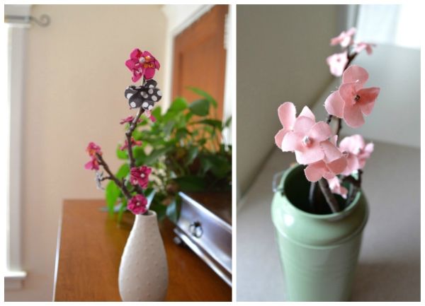 Logo após, quando a cola já estiver seca, posicione a flor em uma das pontas do galho seco. E se você achar que precisa de cola para manter a flor no lugar, aplique um pouco de cola para decoupage no galho, antes de posicionar a flor de papel ou a flor de tecido.