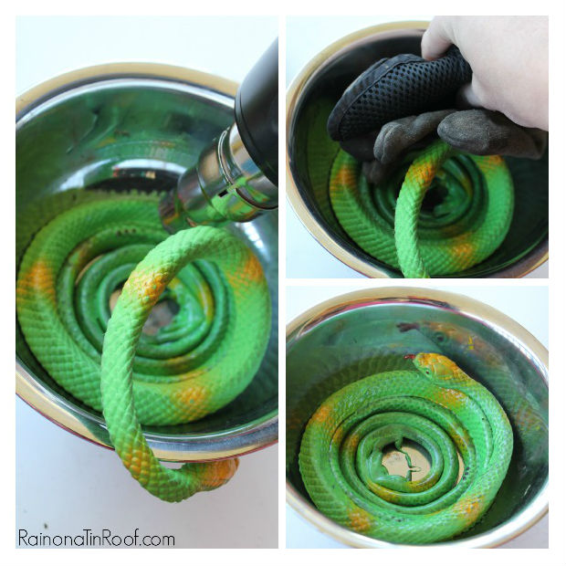 Coloque sua máscara respiradora e envolva a sua cobra de brinquedo em círculo, usando a sua pistola de calor para soldá-la.