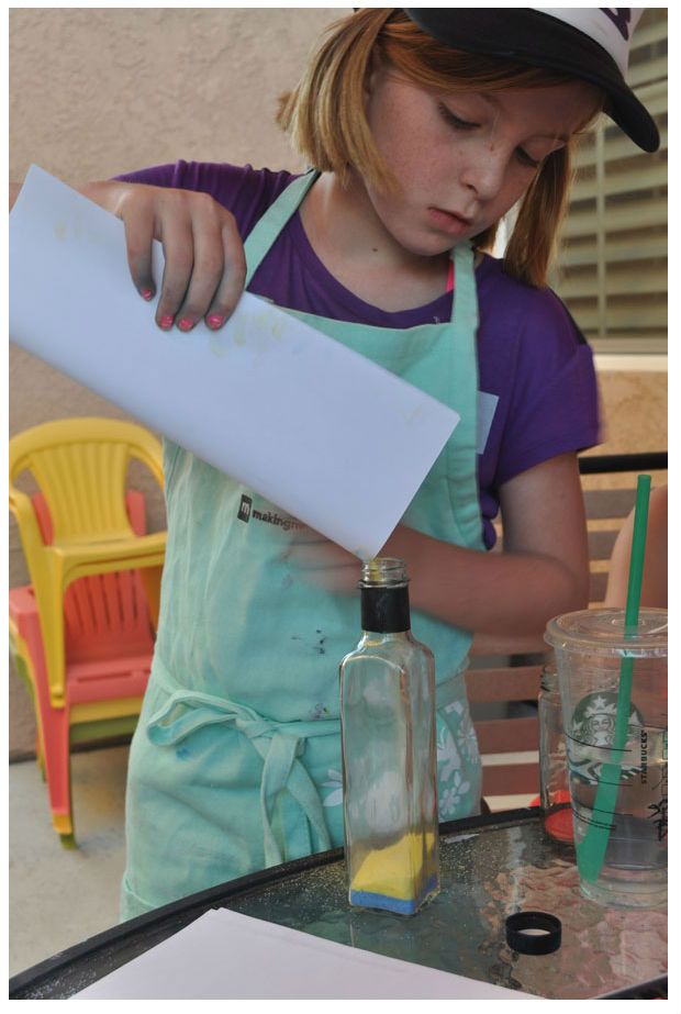 Você poderá colocar cor por cor sobre um recipiente de vidro, um vaso ou algo parecido.