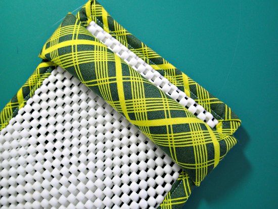 Em seguida, para finalizar a sua peça, costure à mão o rolinho de tecido na peça com a tela antiderrapante. E está pronto!