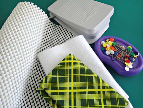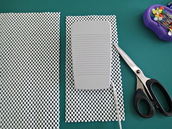 Em seguida, posicione o pedal da sua máquina de costura sobre a tela antiderrapante e corte ao redor, com sobra de tela ao redor de todo o pedal.