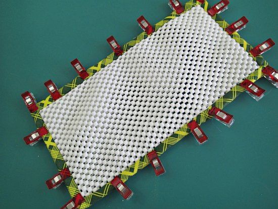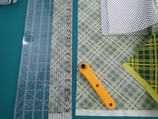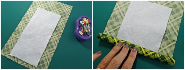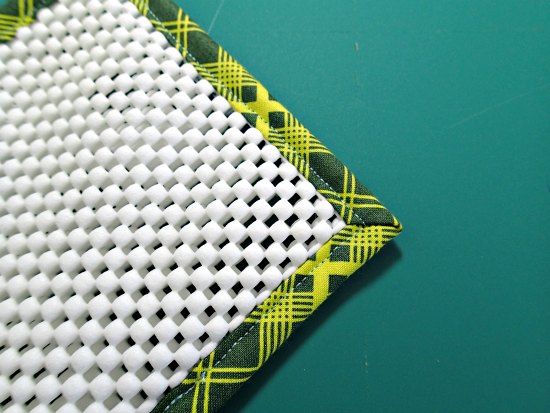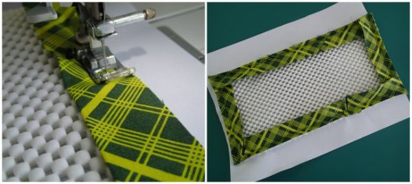 Em seguida, dobre a parte de tecido ao meio, posicione outra parte de tela antiderrapante encaixada na borda e costure.