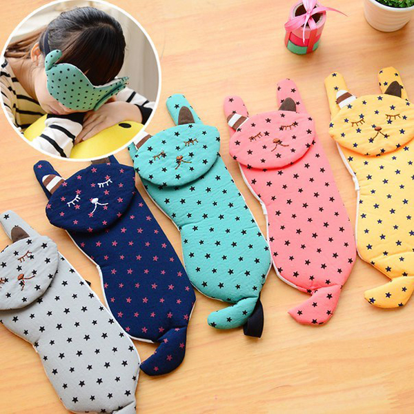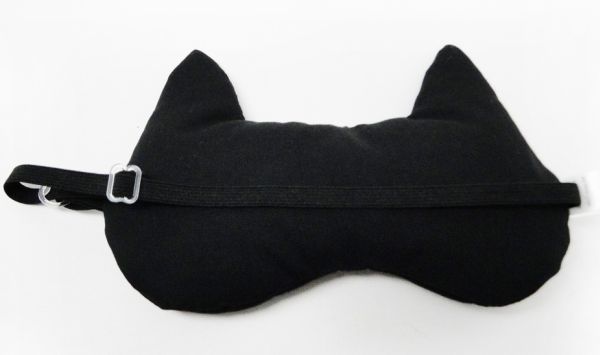 Uma variante da máscara para dormir de gatinho feita de tecido é o modelo com almofadinha extra em um dos lados e com carinha de gato, para a pessoa tirar um cochilo com o rosto encostado no braço.