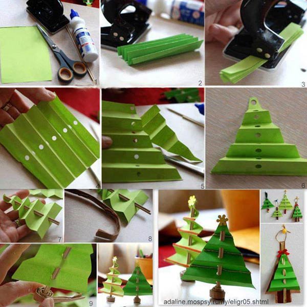 Corte um retângulo no papel verde. Dobre o papel, “sanfonando-o”. Fure o meio da peça. Corte o papel em formato de triângulo. Faça uma tira com o papel marrom e passe no meio da sua árvore. Enrole outra tira de papel marrom, para fazer a base da sua árvore ou faça uma tira com o papel para pendurar a sua miniárvore de Natal. Pinte as dobras do papel e cole um enfeite no topo de sua árvore. E está pronto!