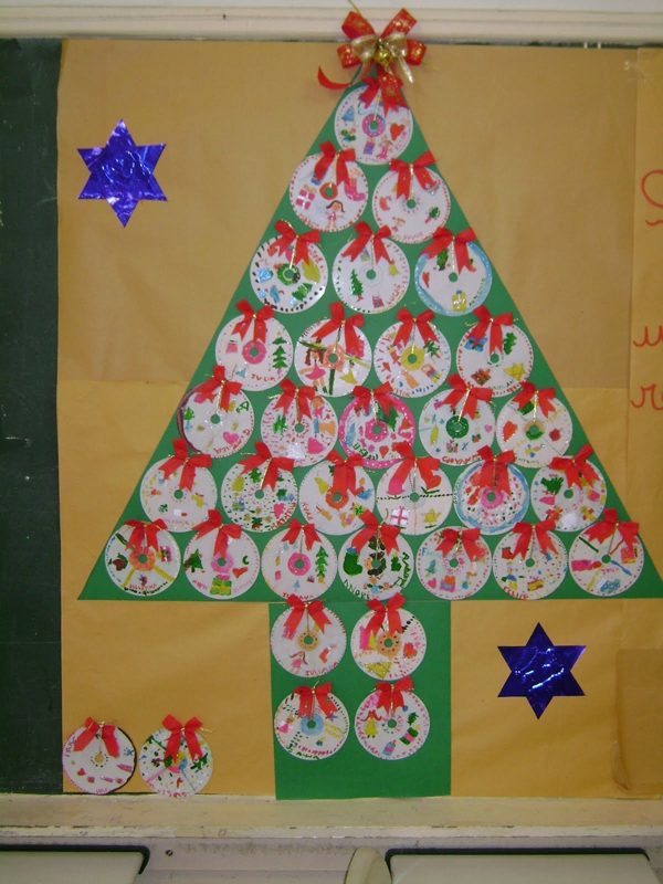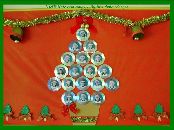 O mural de Natal para escola de educação infantil pode também passar o valor da sustentabilidade, reaproveitamento e preservação da natureza. Você pode pedir para os seus alunos levarem para a sala de aula CDs ou DVDs antigos, para você criarem uma árvore de Natal no mural. E esta árvore de Natal de CDs pode conter também as fotos dos alunos.