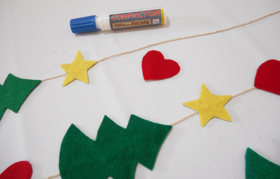 Comece a colar as pecinhas em cada fio de barbante, deixando um espaço.