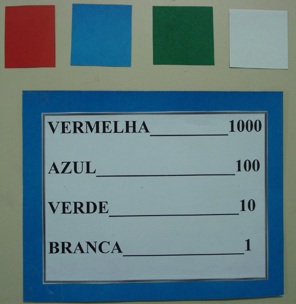 10 fichas coloridas (vermelhas, azuis, verdes e brancas) numeradas de 0 a 9. Cartaz básico (tamanho A4) com cores variadas.