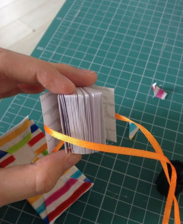Pegue uma folha mais grossinha e cole-a sobre o bloquinho, antes de colar a capa, colando outro pedaço de fita de cetim.