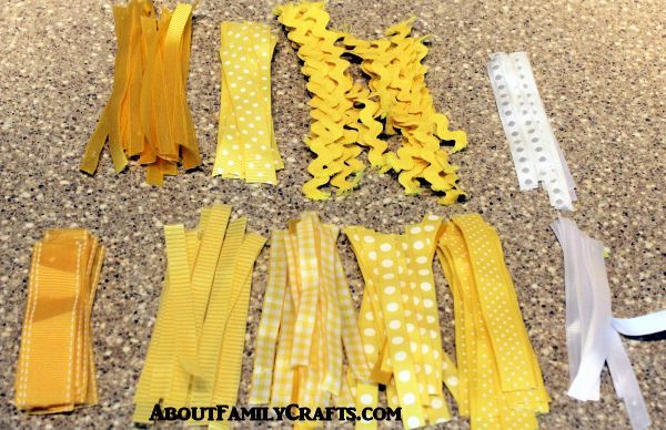 Comece cortando pedaços das fitas, sianinha e passamanarias escolhidas, com o auxílio da tesoura.