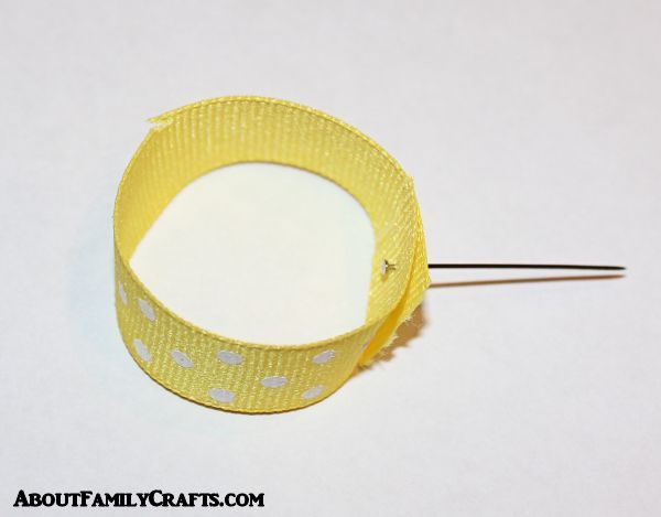 Em seguida, faça um círculo com um pedaço de fita cortando anteriormente e prenda as duas pontas do círculo com um alfinete para costura sem cabeça.