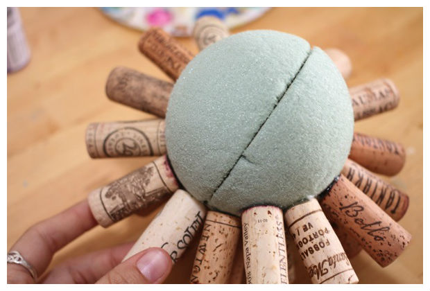 Cole as rolhas sobre a bola de isopor, usando cola quente.