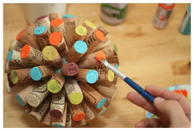 Em seguida, pinte as pontas das rolhas com tinta colorida.