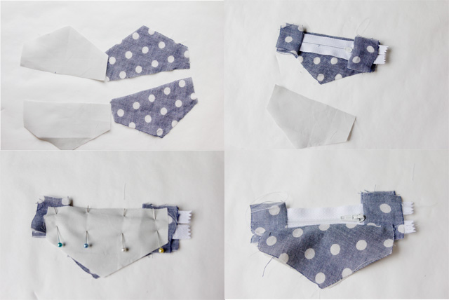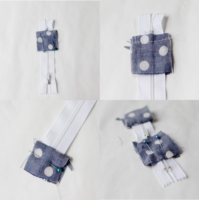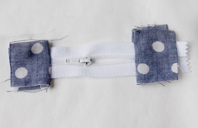 Para começar a sua bolsinha, pegue dois quadrados pequenos e prenda-os ao zíper.