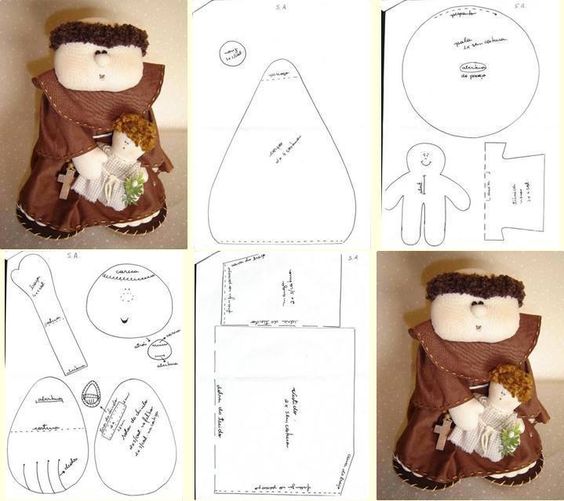 Comece separando todos os materiais que você vai utilizar em seu artesanato. Depois transfira as partes do molde para as respectivas cores dos tecidos ou feltros escolhidos. Costure cada parte separadamente, pelo avesso. Vire-as e encha-as manta acrílica ou outro enchimento de sua preferência. Junte as partes do corpo, coloque as roupinhas e enfeite o seu Santo Antônio com os enfeites e apliques que você preferir. E está pronto!