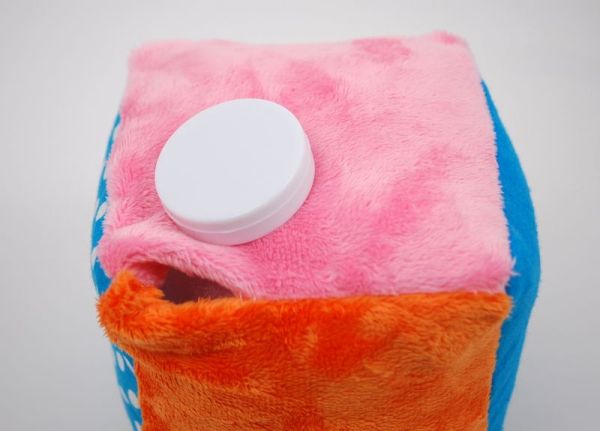 Logo após, vire a peça para o lado do direito do tecido, encha a peça com a manta acrílica ou outro enchimento de sua preferência. E se quiser, coloque um chocalho dentro do seu cubo de tecido.