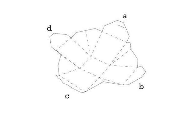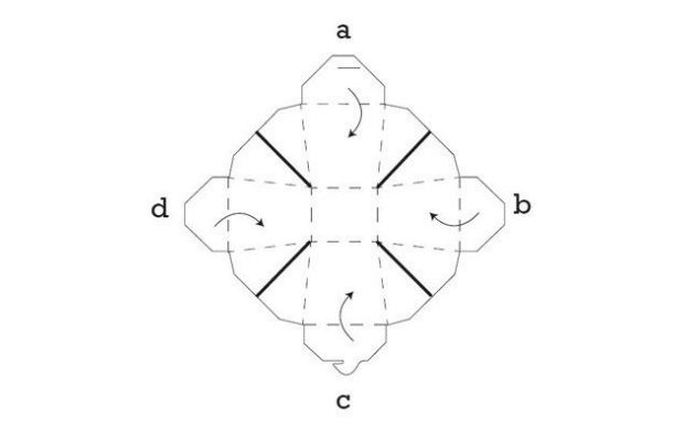 Ao observar as pontas “a” e “c”, perceba que as duas pontas superiores contém uma entrada e um encaixe para o fechamento da caixa.