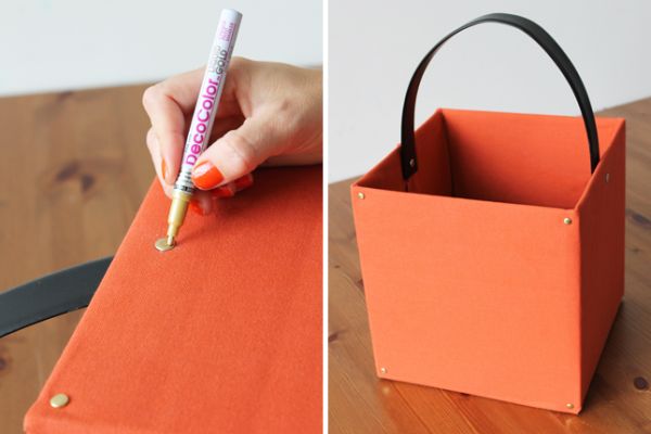 Em seguida, para garantir um charme a mais em sua caixa, fure os cantos da caixa e fixe uma tachinha para papel.