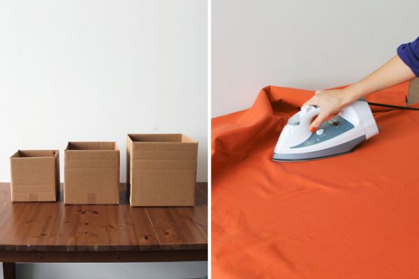 Em seguida, separando as caixas que você vai usar e passando o tecido escolhido, para ficar bem liso ao final do trabalho.