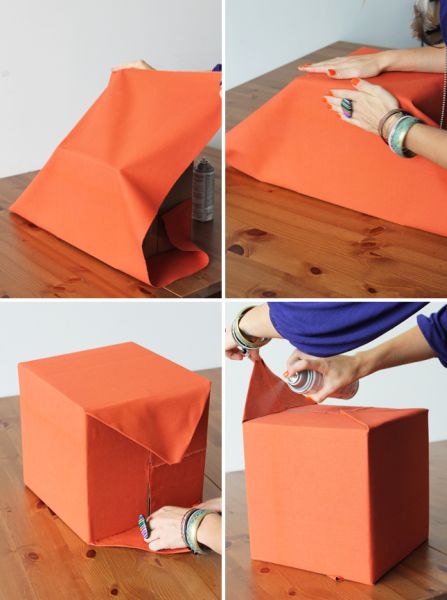 Logo após, meça o tamanho da caixa e passe as medidas para o tecido escolhido. Recorte. E comece a encapar a caixa como se você fosse fazer um embrulho para presente. Utilize a cola em spray.