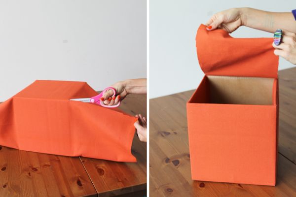 Em seguida, na borda superior, corte o tecido dos cantos da caixa. Depois cole este tecido para dentro. E faça isso nas quatro partes da caixa.