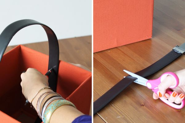 Agora, marque onde irá ficar a alça, fure com o auxílio da furadeira tanto a caixa quanto o cinto e fixe o cinto com parafusos para papel.