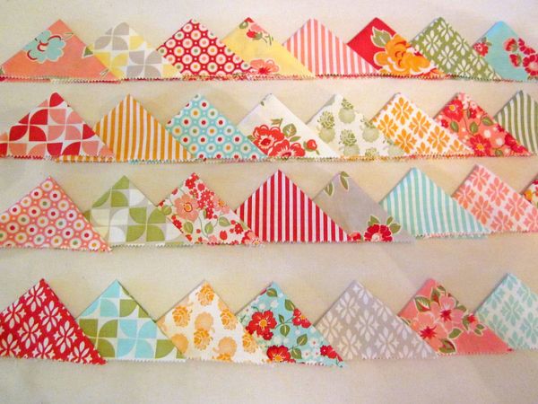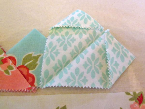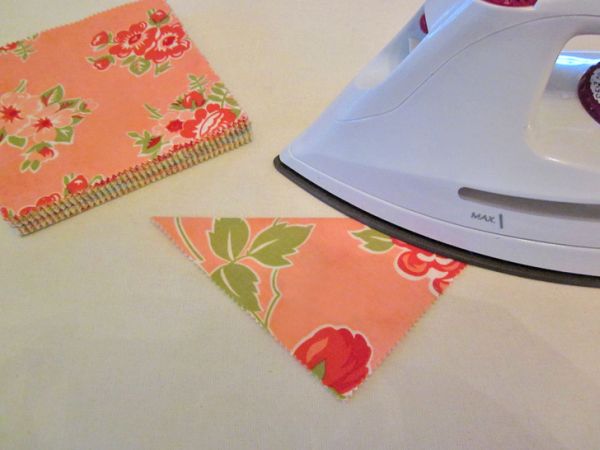 Logo após, siga passando todos os quadrados de tecido e transformando-os em triângulos. Depois posicione um triângulo dentro do outro.