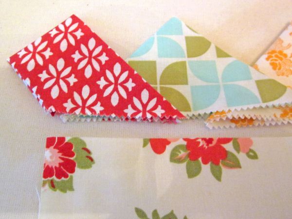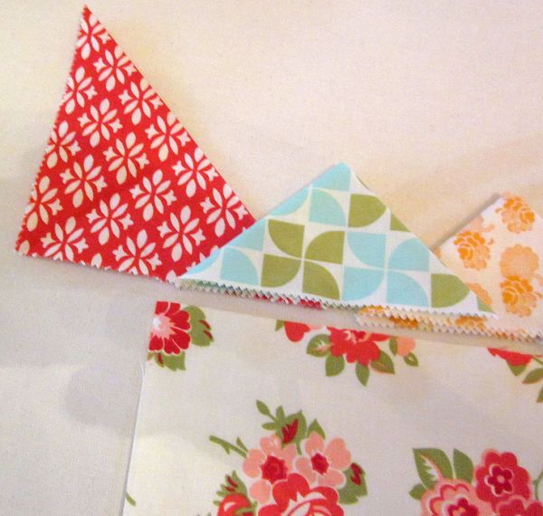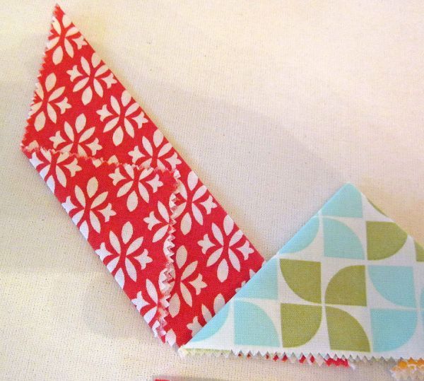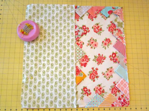 Agora, corte as partes que serão transpassadas para criar a parte detrás de sua almofada. E na parte que irá ficar por cima, costure alguns triângulos de tecido.
