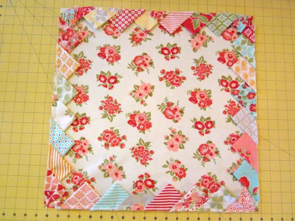 Agora, corte um quadrado no tecido para ser a parte da frente de sua almofada. Posicione estes triângulos em um dos lados. No canto, abra ao último triângulo.