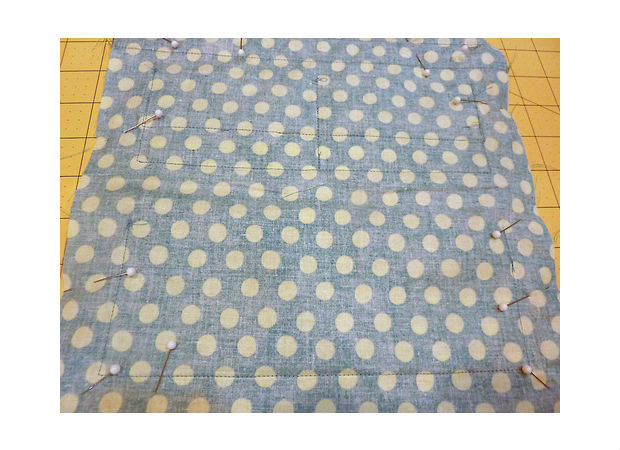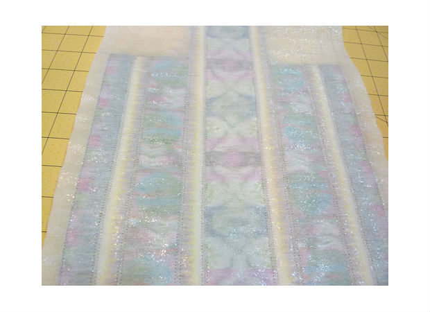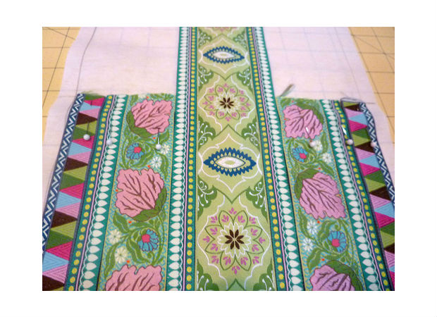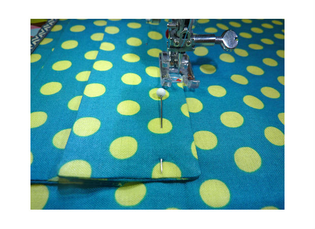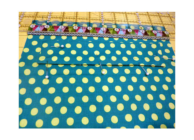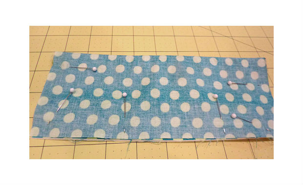 Junte uma fita sobre a outra, prendendo-as com alfinetes, como você pode ver na imagem acima.