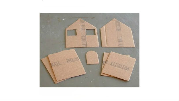O primeiro passo que você precisará fazer é desenhar cada parte da casinha, conforme no desenho acima, no papelão.