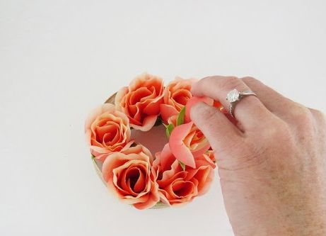 Em seguida, corte os caules de algumas flores artificiais escolhidas. E comece a fixar as flores principais na parte que você desejar em seu círculo de isopor.